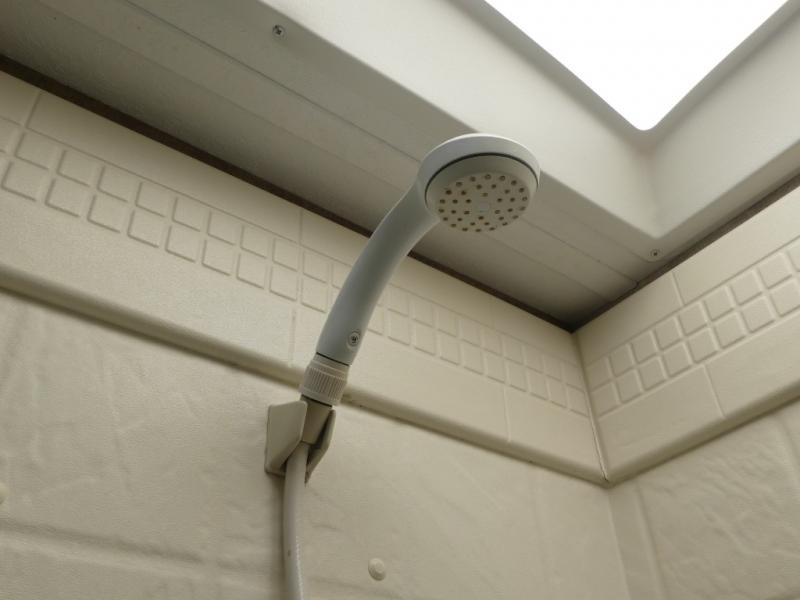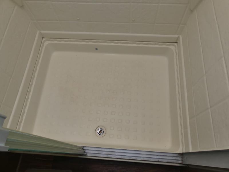 Stepping up the stairs, the bathroom is to the left. Inside the bathroom you will find a toilet, shower, closet with drawers, linen cabinet, and sink.