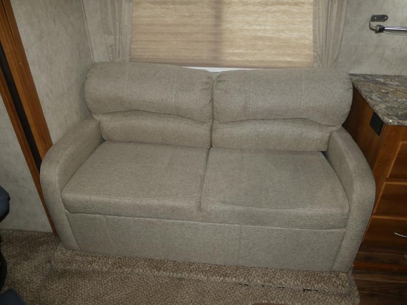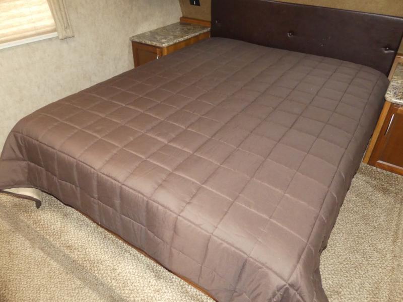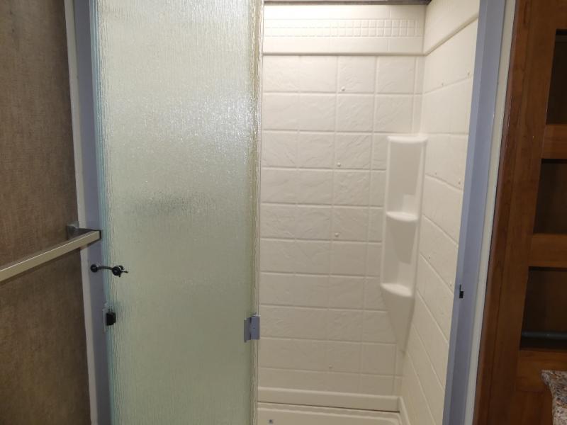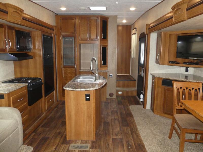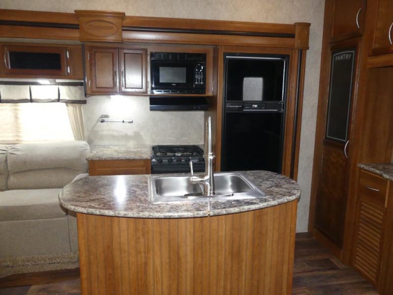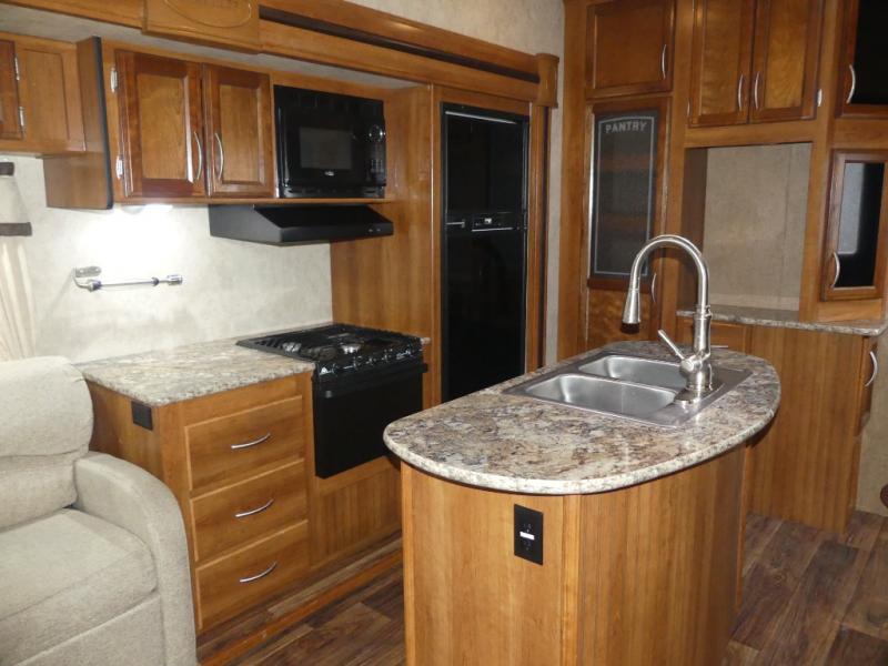 When you enter the fifth wheel, your eyes will gaze through the rear of the fifth wheel and you will immediately see the living/kitchen areas. To the left of the entrance there is a slide with an entertainment center and a dinette. The other slide in the rear has a sofa, three burner range, and refrigerator. Next to the slide you will find a nice size pantry and a hutch. In the middle of the kitchen there is a convenient kitchen island which has extra counter space and a double kitchen sink.