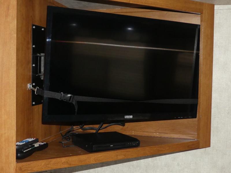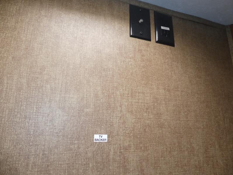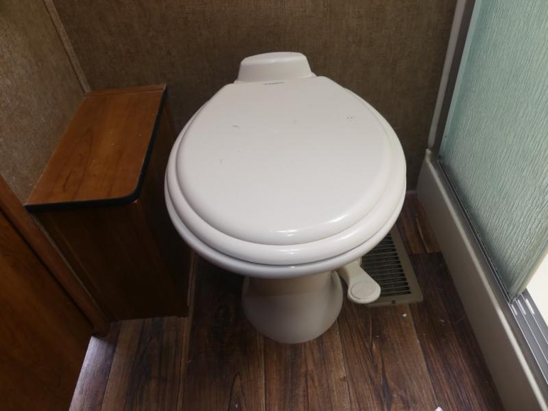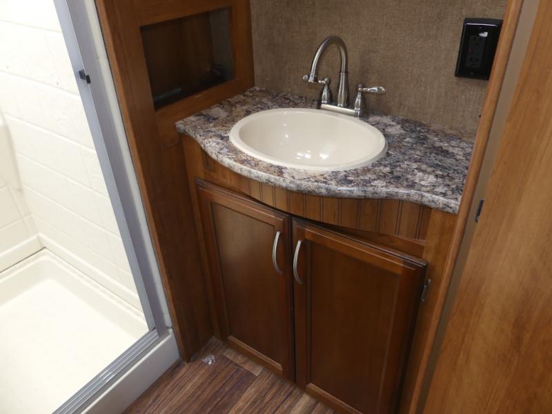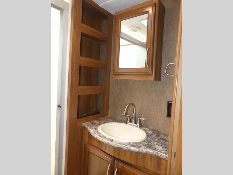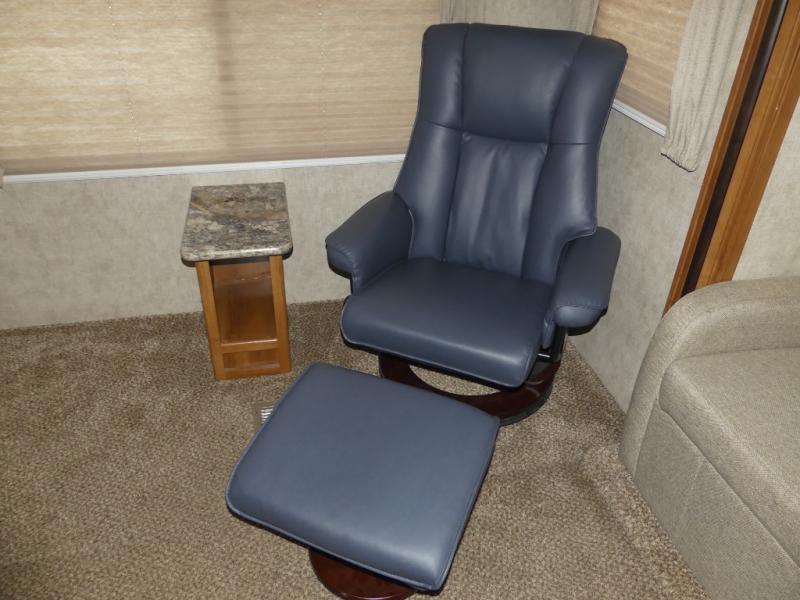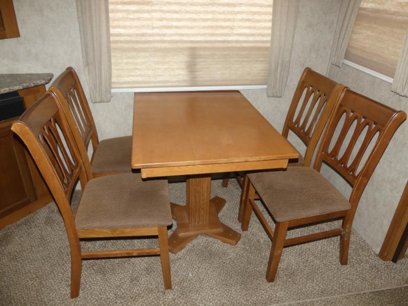 When you enter the fifth wheel, your eyes will gaze through the rear of the fifth wheel and you will immediately see the living/kitchen areas. To the left of the entrance there is a slide with an entertainment center and a dinette. The other slide in the rear has a sofa, three burner range, and refrigerator. Next to the slide you will find a nice size pantry and a hutch. In the middle of the kitchen there is a convenient kitchen island which has extra counter space and a double kitchen sink.