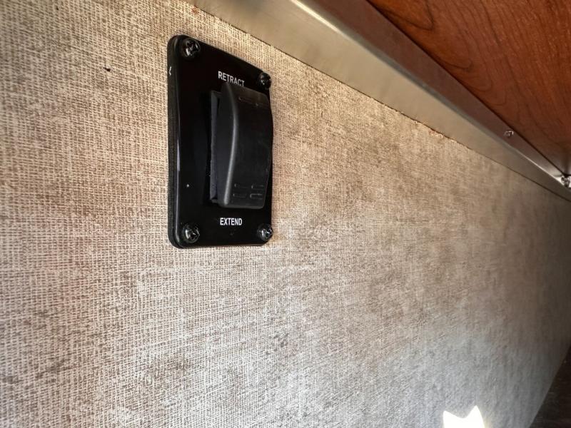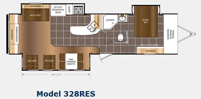 As you enter the travel trailer, to the left there is a slide with a free-standing dinette and two recliners. Along the rear wall you will find an entertainment center. The other slide offers a hide-a-bed, refrigerator, pantry, and three burner range. There is a l-shaped counter which provides much counter space as well as a double kitchen sink.
