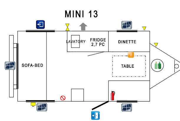 Prolite offers the Mini 13 travel trailer with a rear sofa bed and a front dinette.