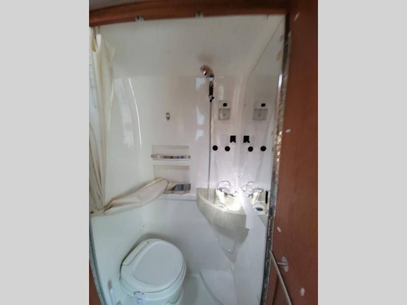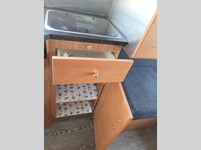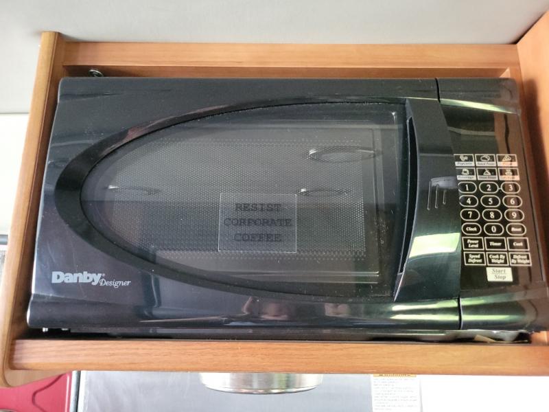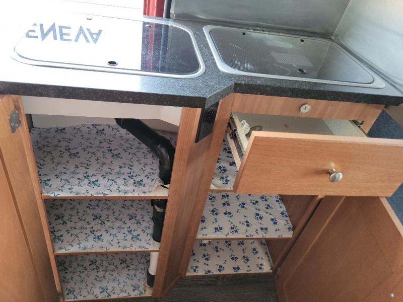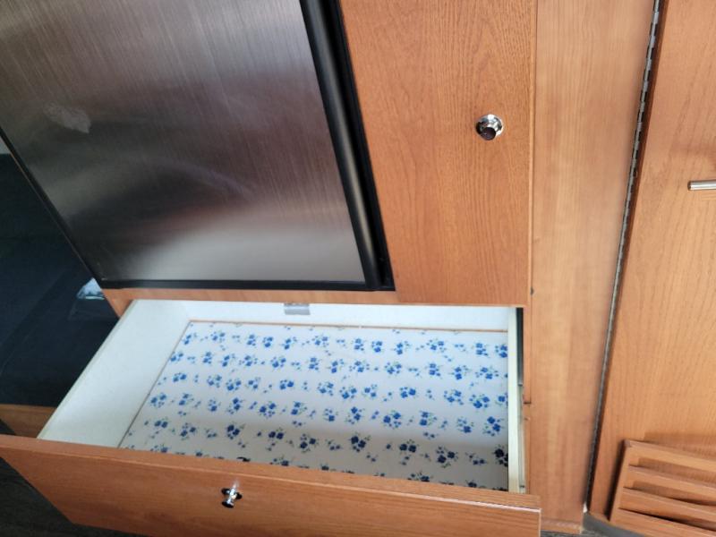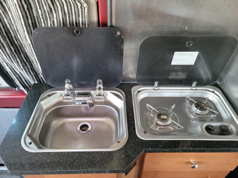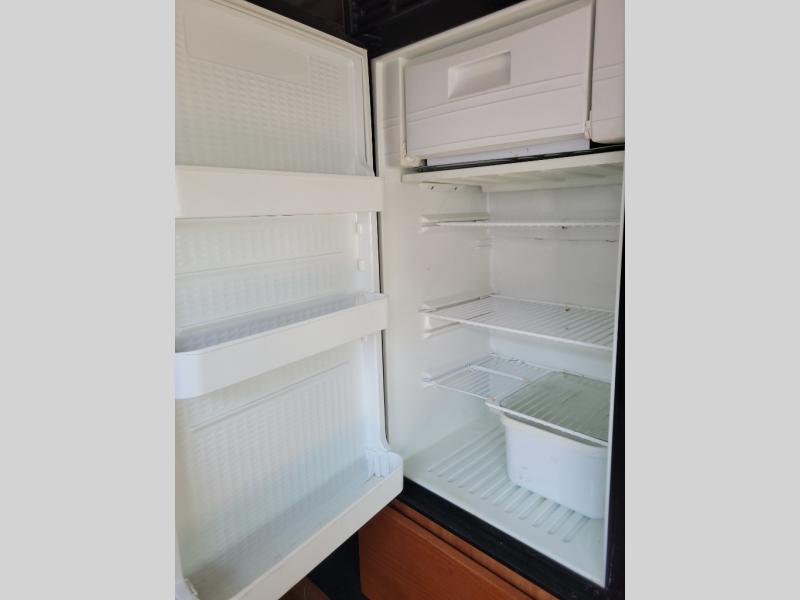 As you are in the motor home, you will find along one side a sink, microwave, and propane stove. Across from the stove there is a 5 cu. ft. refrigerator.