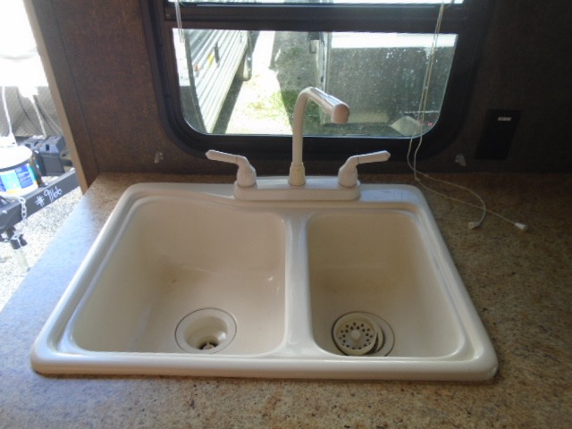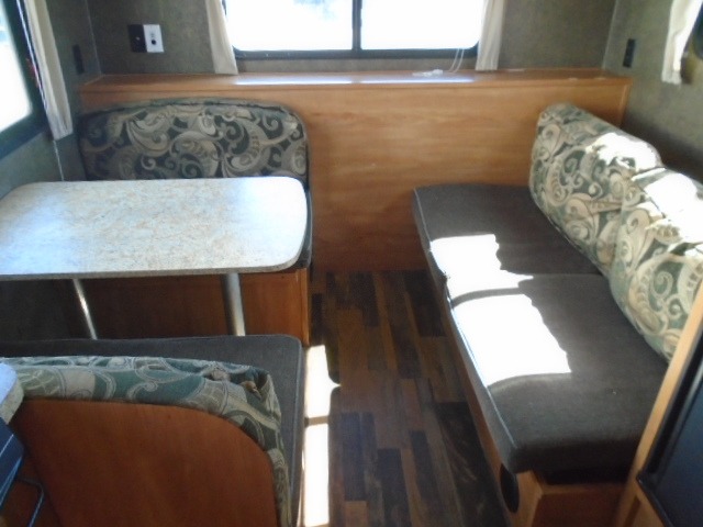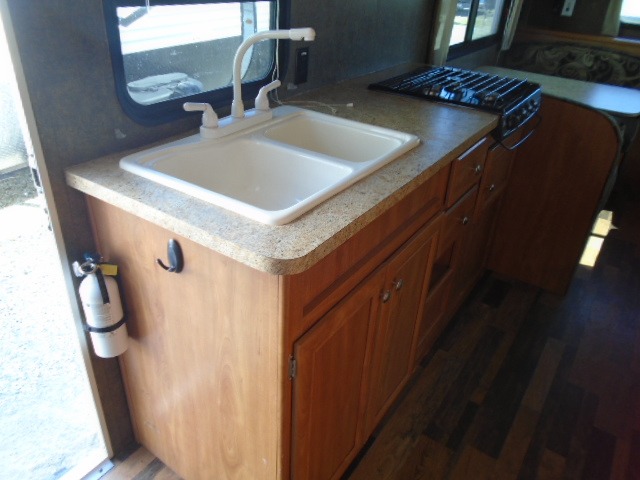 Stepping inside the travel trailer, to the left there is a double kitchen sink, three burner rang and booth dinette. The opposite side of the trailer has a 60" sofa, refrigerator and pantry.