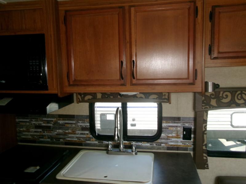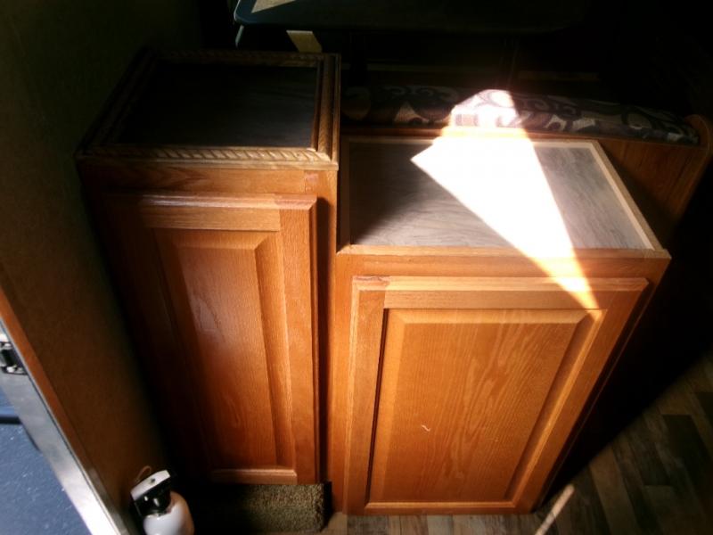 Across from the dinette is a refrigerator, three burner range with microwave oven, and kitchen sink which makes cleaning up a breeze. Store dishes and supplies in the overhead cabinets throughout the space.