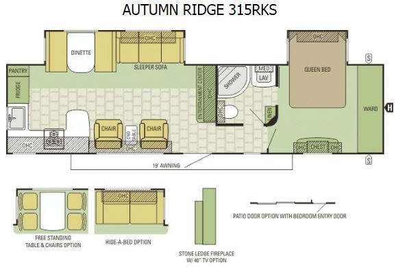A free standing dinette with four chairs and a hide-a-bed sofa are both optional in place of the booth dinette and sleeper sofa provided. You can also add an optional stone ledge fireplace with 40" TV if you like, and a patio door with separate bedroom option, plus so much more!