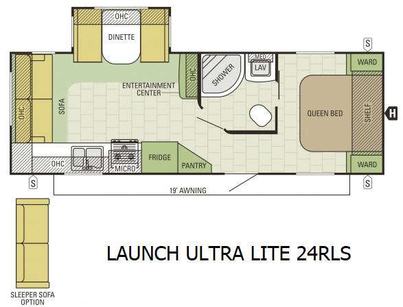Cook all of your favorite meals and snacks in this Launch Ultra Lite kitchen featuring a pantry for dry goods, a refrigerator, a three burner range with microwave oven, and double kitchen sink for easy cleanup. The dinette is located across the room in a slide out with overhead storage.