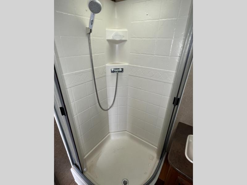 The bath is straight ahead through the entry door and can be accessed from the living area or from within the front bedroom. The bath features a corner shower, toilet, and sink with medicine cabinet.