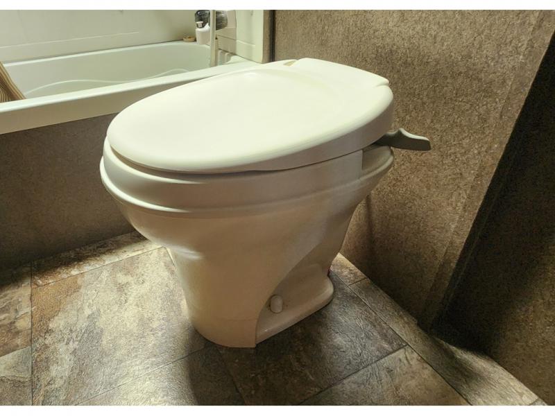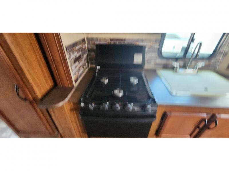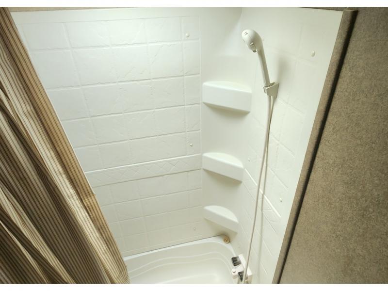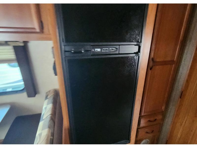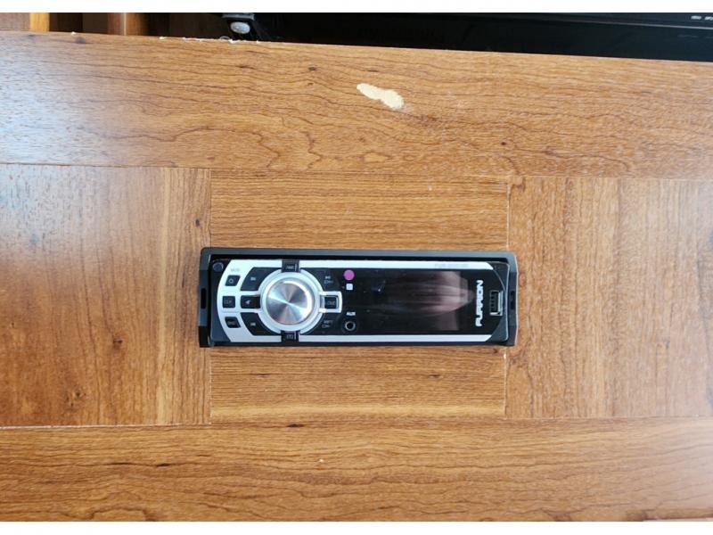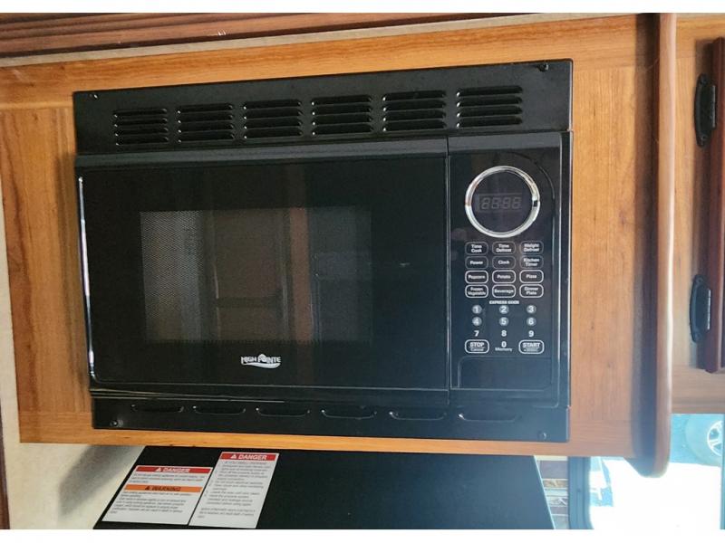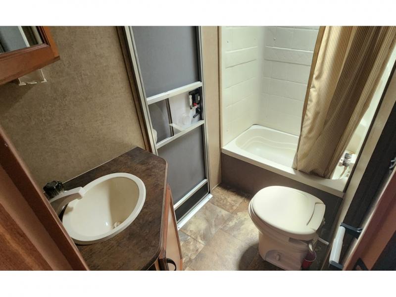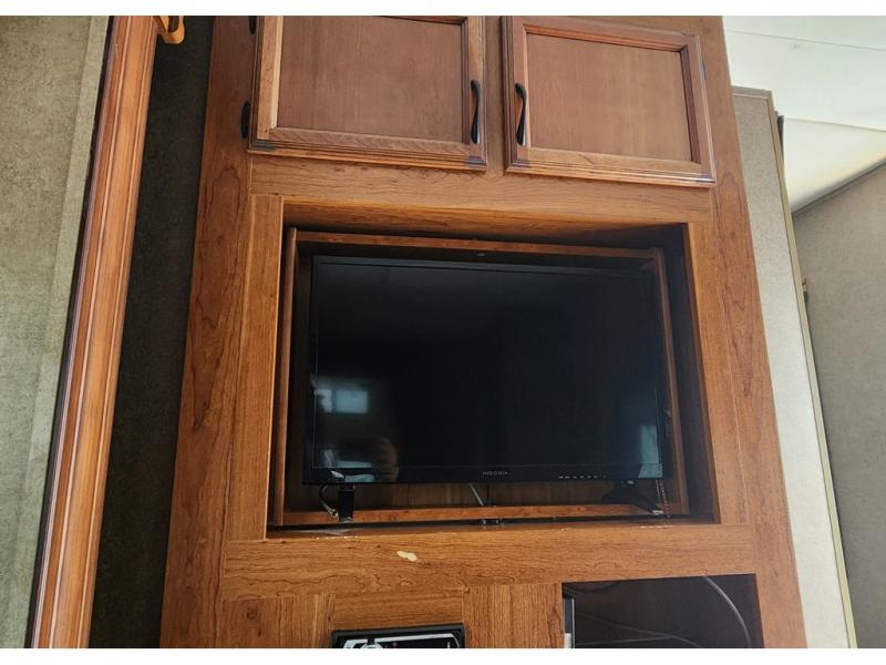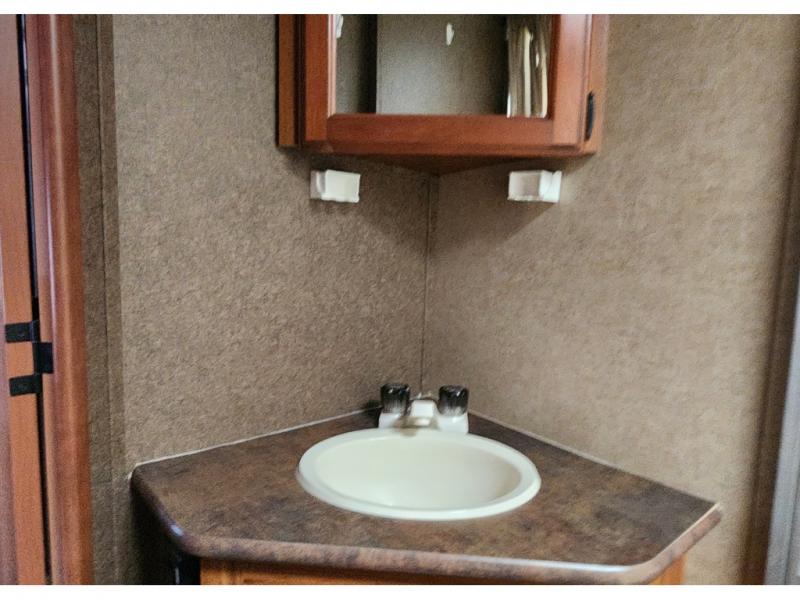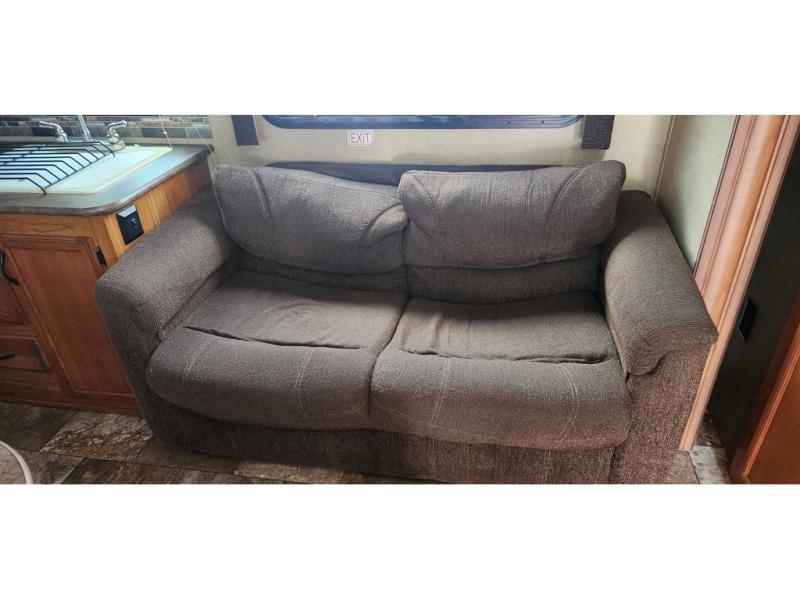 There is an entertainment center along the interior wall that can be viewed easily from a jackknife sofa in the slide out, and the booth dinette on the opposite side. Both can be made into additional sleeping space if needed also.