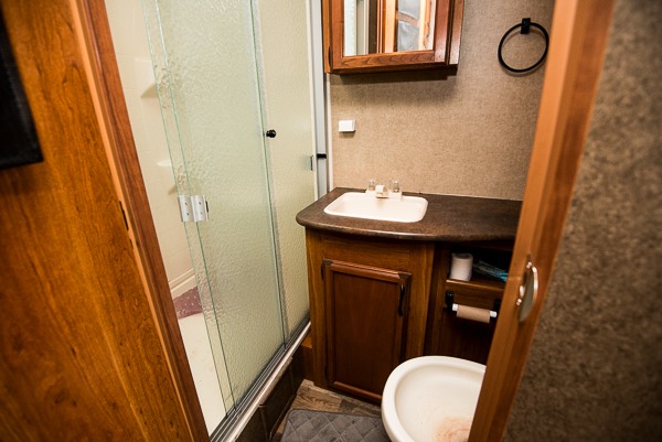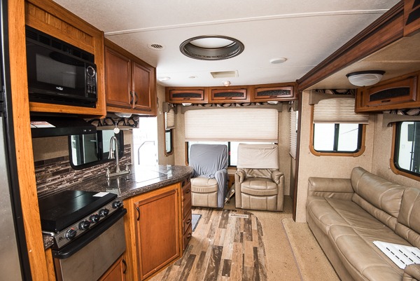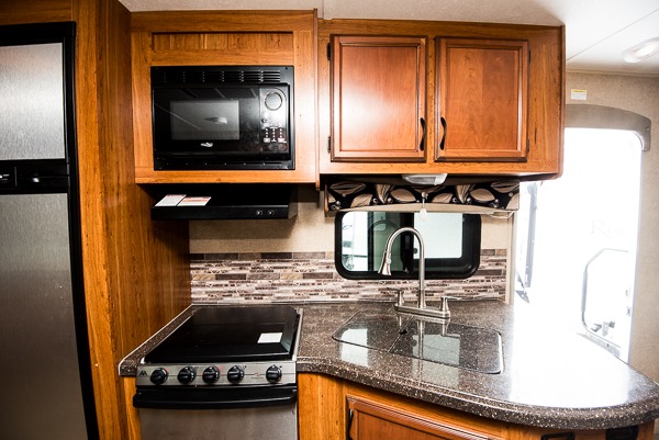 The kitchen has everything you need to prepare and cook food while you travel. There is a pantry for storage, a refrigerator, a three burner range with microwave oven above, and large kitchen sink. There is also a counter extension when you need a bit more room for things.