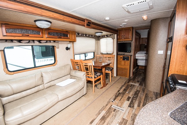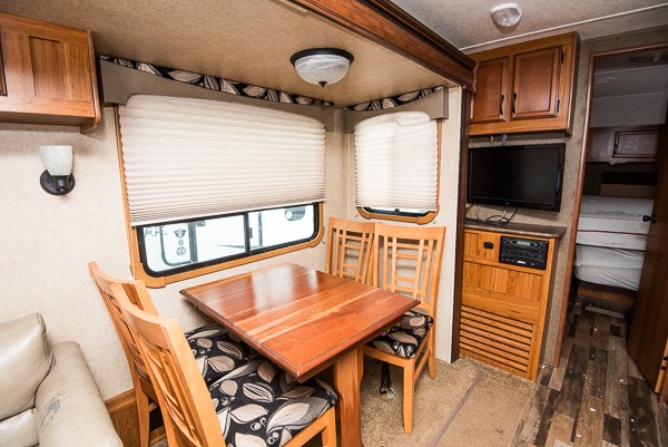 Straight ahead there is a slide out sleeper sofa with booth dinette which provides plenty of seating for meal time or just hanging out. Both can be made into additional sleeping if needed for family or extra guests. The entertainment center nearby can easily be viewed and features an overhead cabinet also.