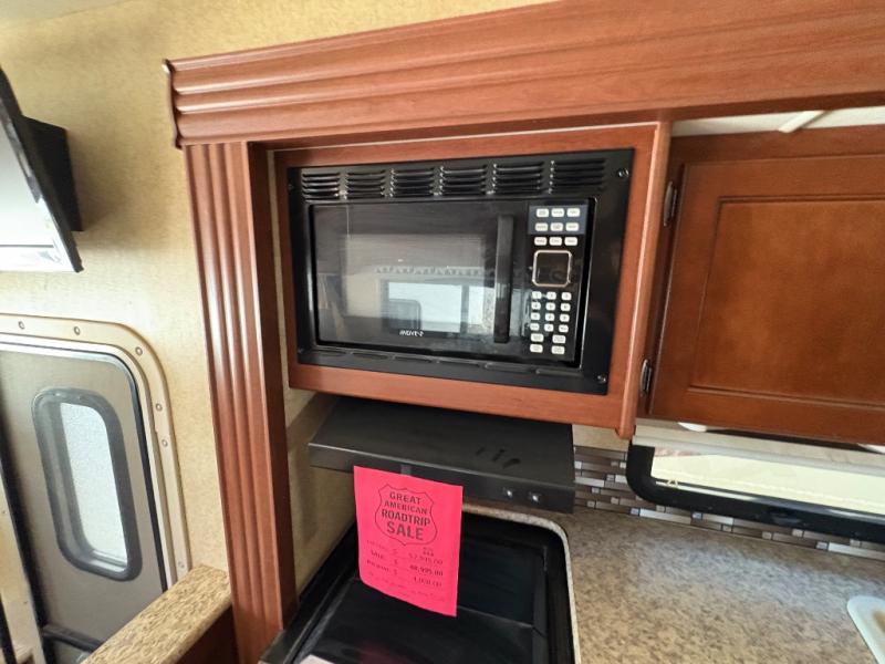 As you step inside model 27.1 you will see a pretty open interior with the passenger side slide fully extended. There is a three burner range with microwave oven just inside the door on your left, a counter area with round kitchen sink, and refrigerator with pull-out pantry next to it. All of this allows you to easily cook food while you are away from home.