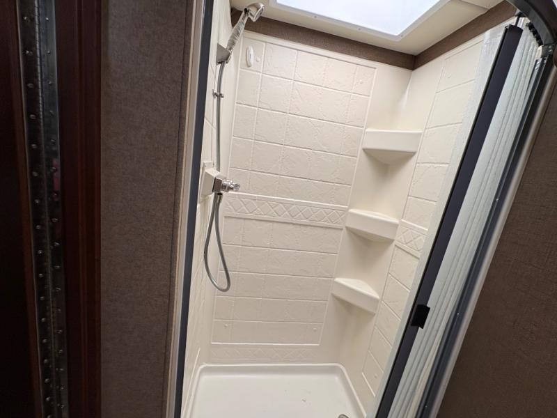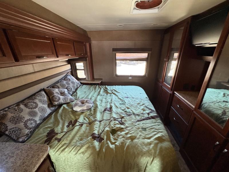 A sliding door takes you into the spacious rear bedroom with a king bed within a slide (continuing the curb side slide) along with nightstands and overhead cabinets. There are closets and drawers opposite the bed and so much more!