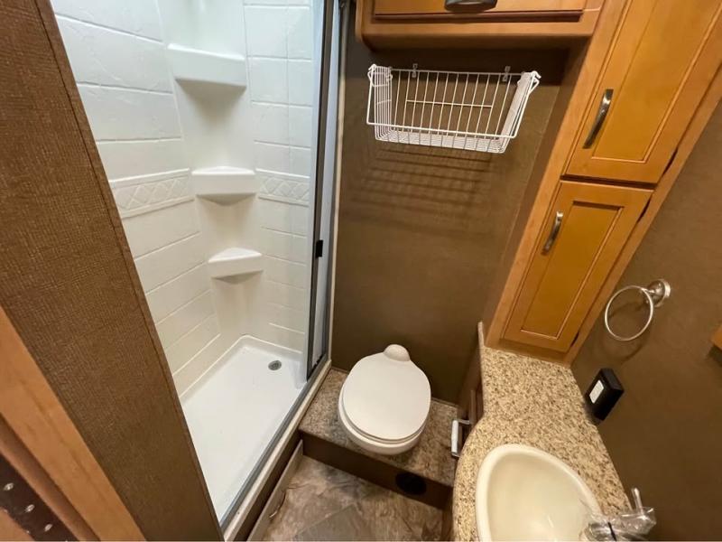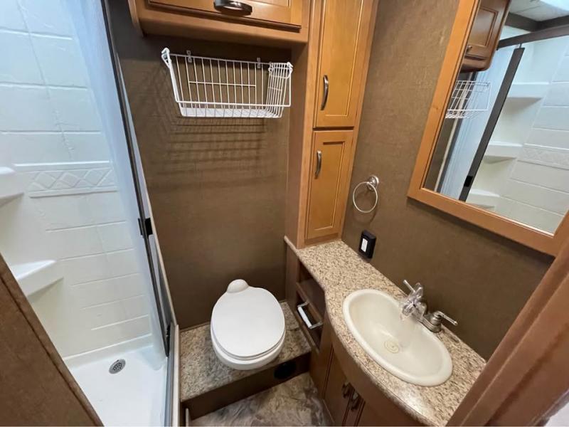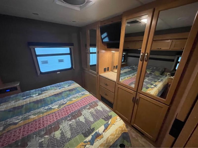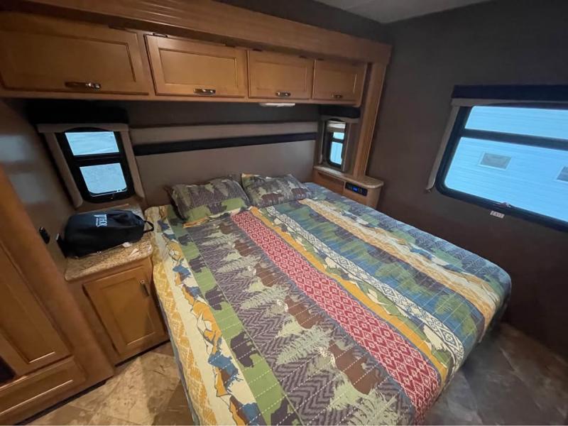 A sliding door takes you into the spacious rear bedroom with a king bed within a slide (continuing the curb side slide) along with nightstands and overhead cabinets. There are closets and drawers opposite the bed and so much more!