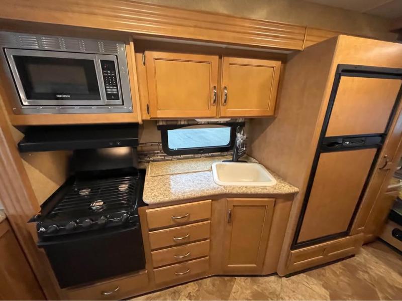 As you step inside model 27.1 you will see a pretty open interior with the passenger side slide fully extended. There is a three burner range with microwave oven just inside the door on your left, a counter area with round kitchen sink, and refrigerator with pull-out pantry next to it. All of this allows you to easily cook food while you are away from home.