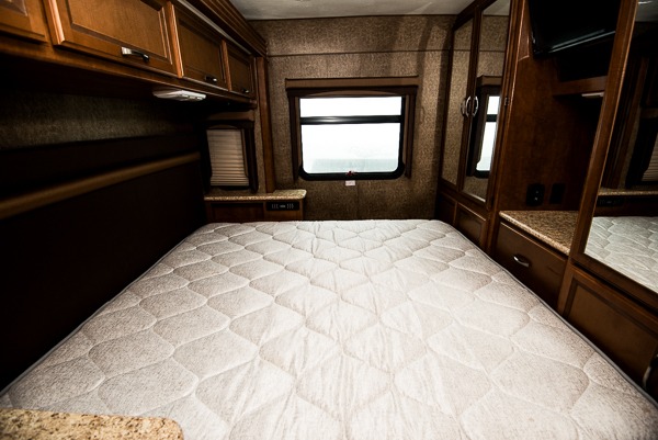 A sliding door takes you into the spacious rear bedroom with a king bed within a slide (continuing the curb side slide) along with nightstands and overhead cabinets. There are closets and drawers opposite the bed and so much more!