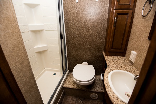 The bath features a shower, toilet, and vanity with sink as well as overhead storage. There is also a linen cabinet just outside the bath door.