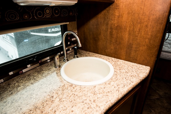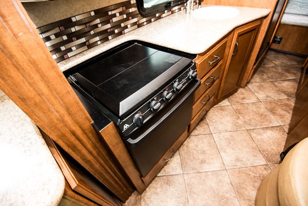 As you step inside model 27.1 you will see a pretty open interior with the passenger side slide fully extended. There is a three burner range with microwave oven just inside the door on your left, a counter area with round kitchen sink, and refrigerator with pull-out pantry next to it. All of this allows you to easily cook food while you are away from home.