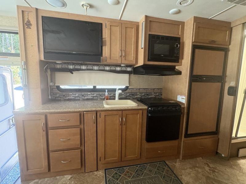 The kitchen features a counter area, pull-out pantry for storage, overhead cabinet for dishes and things, a single sink, three burner range with microwave oven above, and refrigerator. A 32" TV is mounted opposite the slide for easy viewing from all seating options.