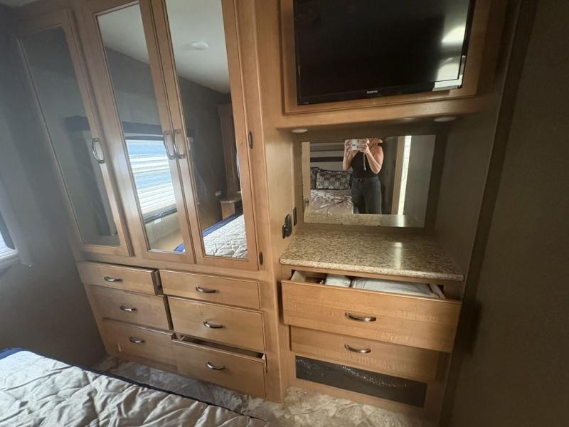 As you enter the rear bedroom you will see a comfy queen bed slide with nightstands and overhead cabinets as well as plenty of closet and drawer storage on the right. Between the closets you can choose to have an optional 24" LED TV.