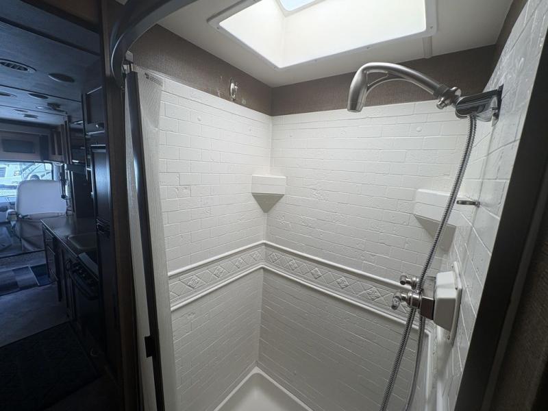 Heading toward the back of the coach you will pass through the bath area with a shower on the left, and private toilet area with vanity sink, overhead cabinets, and linen storage on the right.