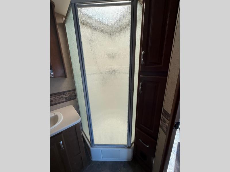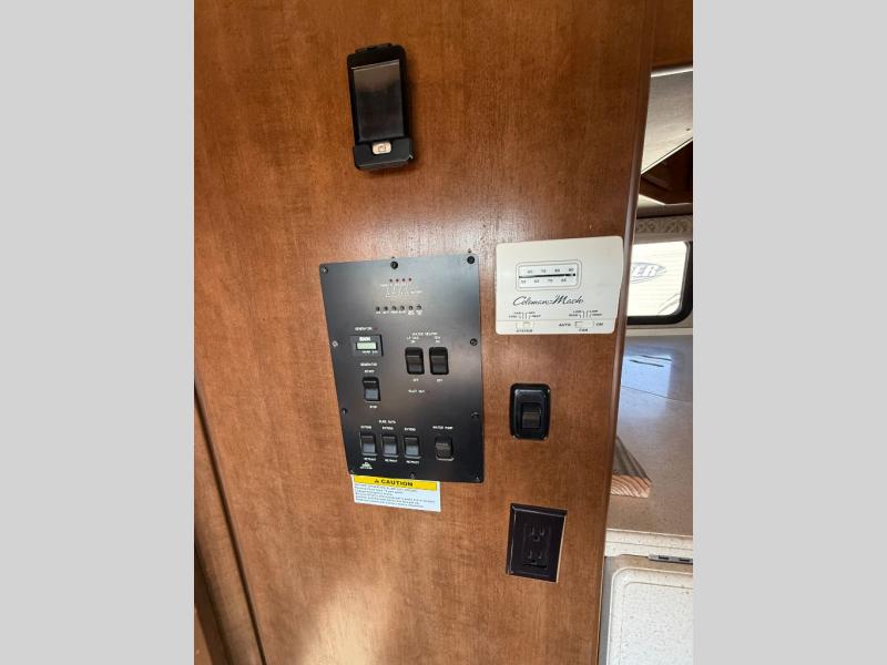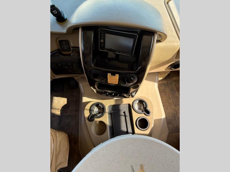 Back up front there is a coffee table between the two captain's chairs. If outside relaxing is something you enjoy, the 32" LED TV is located beside the entry door.