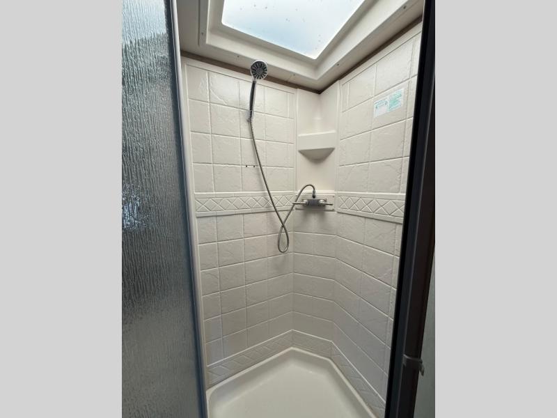 The rear bedroom features a king size bed with nightstands on either side. The master bath is accessible from within the bedroom or from the dining area. The bath features a 34" x 34" angled shower, a toilet, a sink with overhead cabinet, and linen cabinet too.