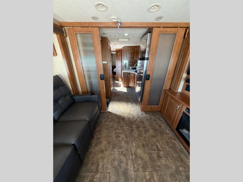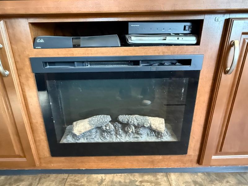 Step inside and find a front living room beyond the cab area featuring dual opposing slides. The door side slide features a sofa with air bed as well as overhead storage. The opposite side features a slide with an electric fireplace with a remote and a 40" LED TV just above. Pocket doors separate the living space from the kitchen for added convenience when using the room for sleeping space. There is also an optional overhead bunk above the cab area for even more sleeping space for guests.