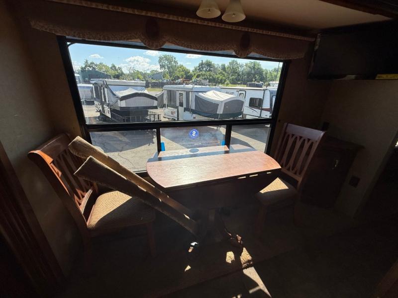 A slide out with a free standing round dinette table and corner 26" LED TV will seat four comfortably while eating, playing games, or watching shows. The rest of the slide continues into the bedroom. This slide features closets on both sides of the dresser with a 28" TV above.