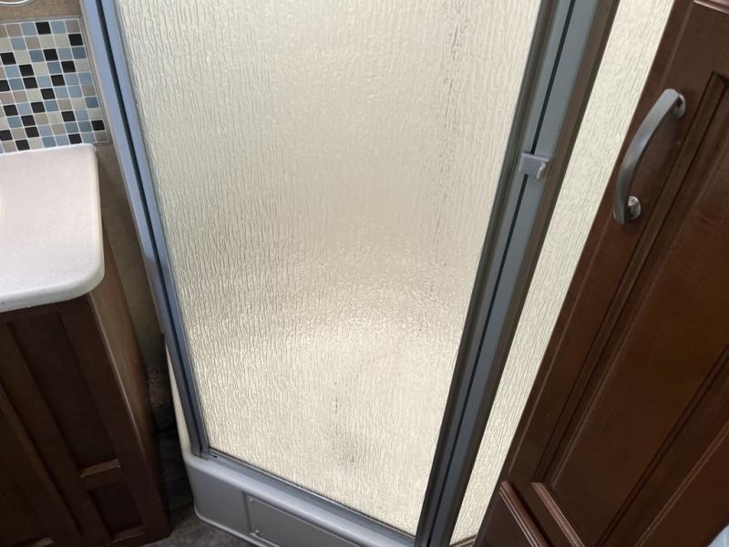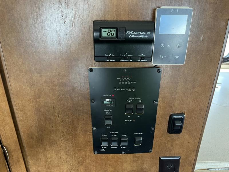 Back up front there is a coffee table between the two captain's chairs. If outside relaxing is something you enjoy, the 32" LED TV is located beside the entry door.