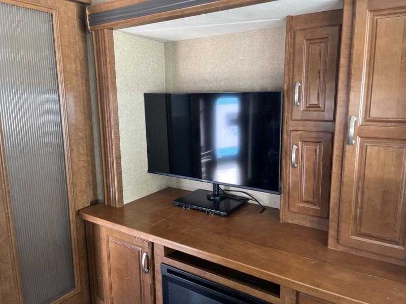 Step inside and find a front living room beyond the cab area featuring dual opposing slides. The door side slide features a sofa with air bed as well as overhead storage. The opposite side features a slide with an electric fireplace with a remote and a 40" LED TV just above. Pocket doors separate the living space from the kitchen for added convenience when using the room for sleeping space. There is also an optional overhead bunk above the cab area for even more sleeping space for guests.