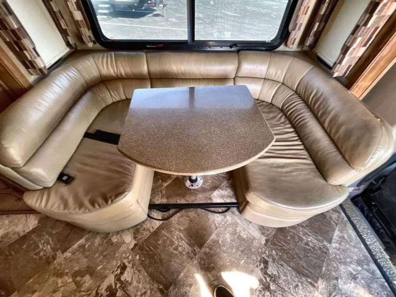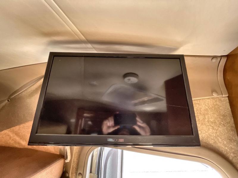 The kitchen/living area features a refrigerator, two burner range top, overhead microwave, a single kitchen sink and overhead cabinets. A combination sofa dinette with a pedestal table is found in the second slide with a 26" TV mounted on a view slide for convenience. Extra sleeping space is available in a bunk over the cab.