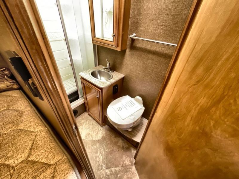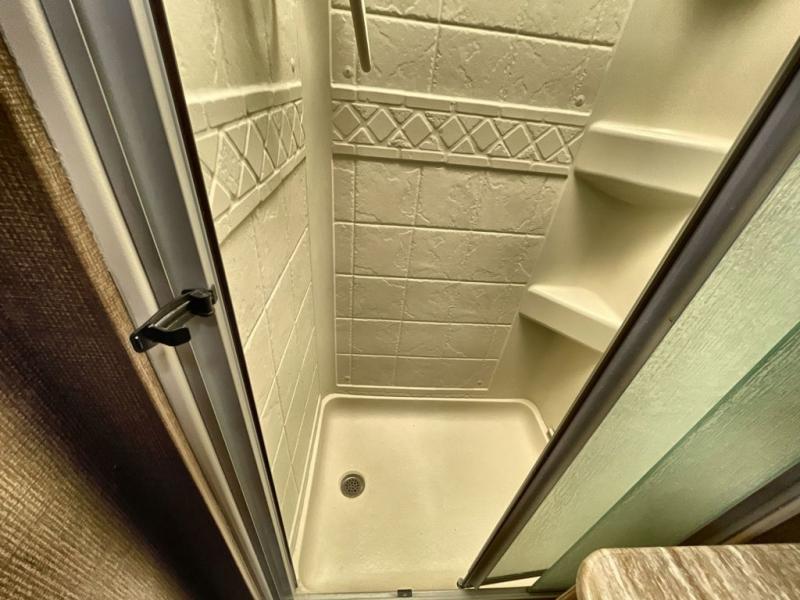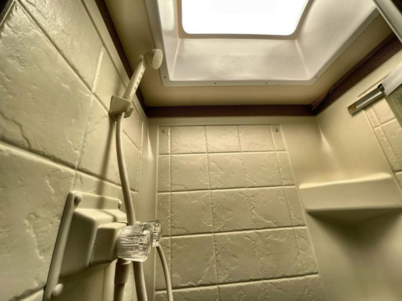 The rear slide out features a queen bed with nightstands and overhead storage. A side aisle bath includes a flip-up countertop, sink, angled corner shower, and a toilet with overhead storage. A closet is located across from the bath.