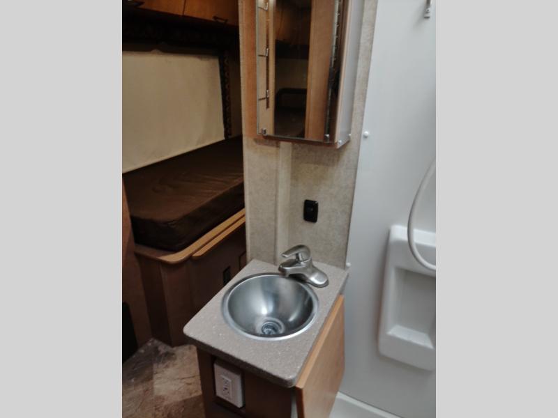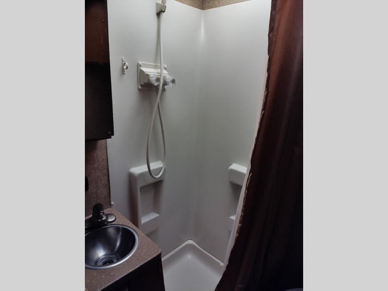 A 22" TV is mounted above the entry door with a single round kitchen sink, overhead cabinets, two burner range top, overhead microwave, refrigerator and a closet along the wall to your left. A side aisle bathroom features a sink, medicine cabinet, angled corner shower, a toilet and overhead cabinet.