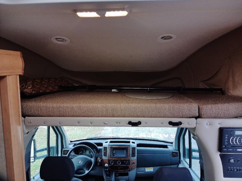 Twin beds fill the back of the motor home and can be converted into a full width king size bed. A bunk over the cab offers additional sleeping space.