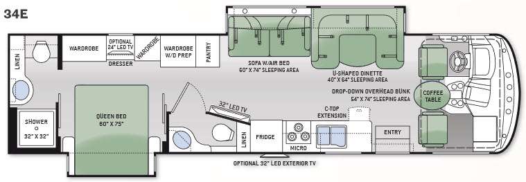 Across the front, you may choose to use the drop-down overhead bunk above the cab for more sleeping space.