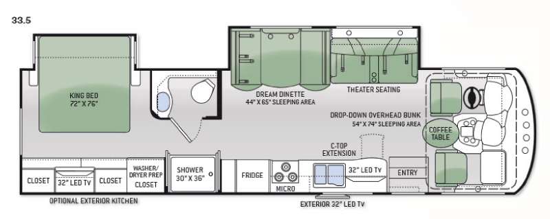 Enter behind the passenger seat and find a slide out theater seat for two and a dream dinette with 44" x 65" sleeping area directly across from the door. There are seat belts on both seating areas to create a safe travel environment.