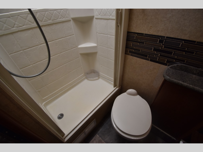 A side aisle bath features a 24" x 36" shower, a toilet, and large vanity with sink. You will also enjoy plenty of overhead storage in the bathroom as well for towels and toiletries.