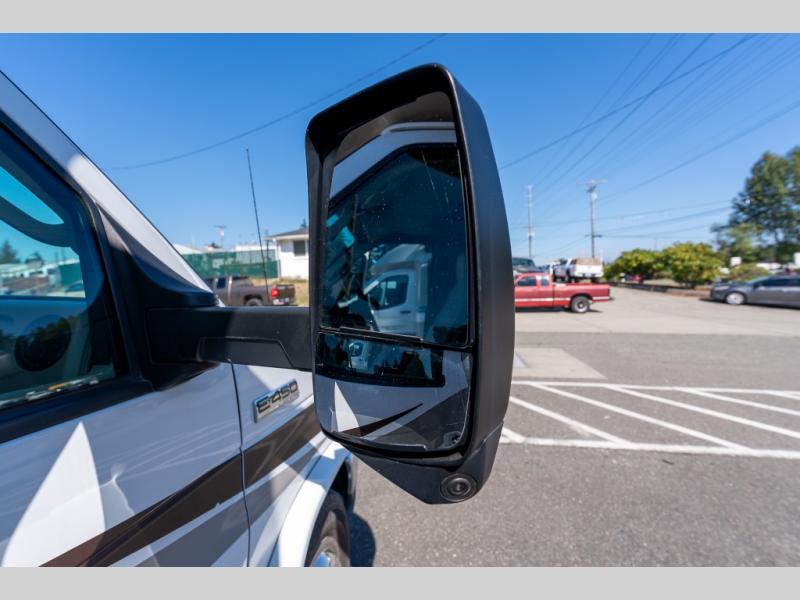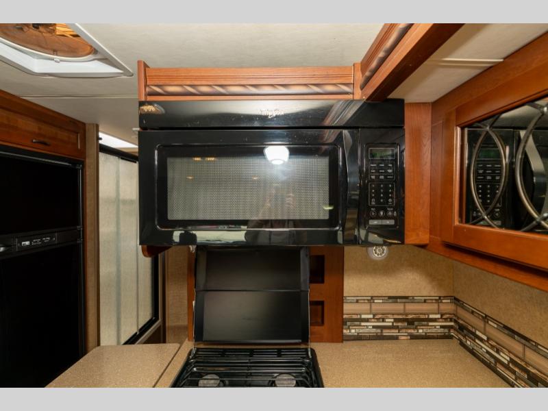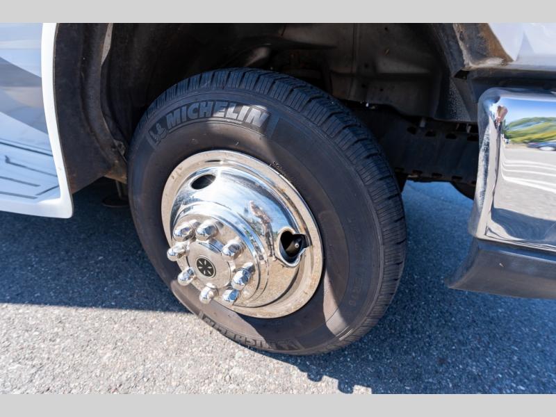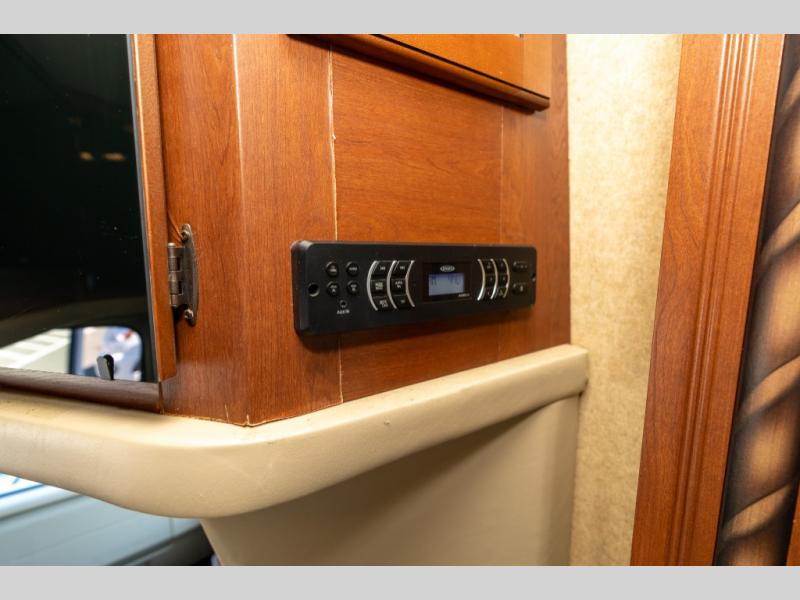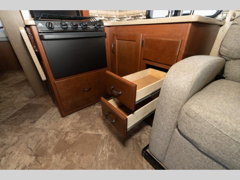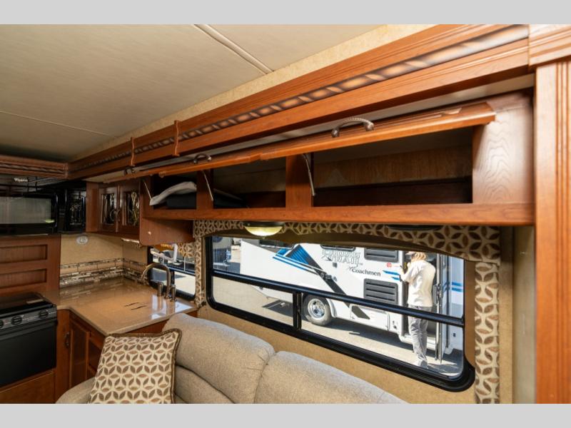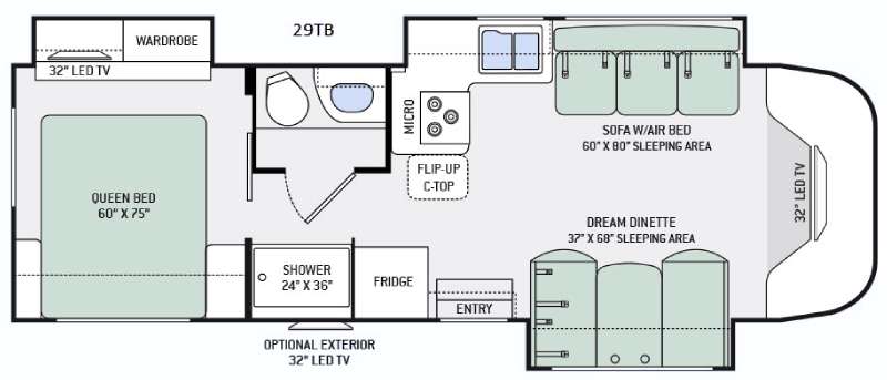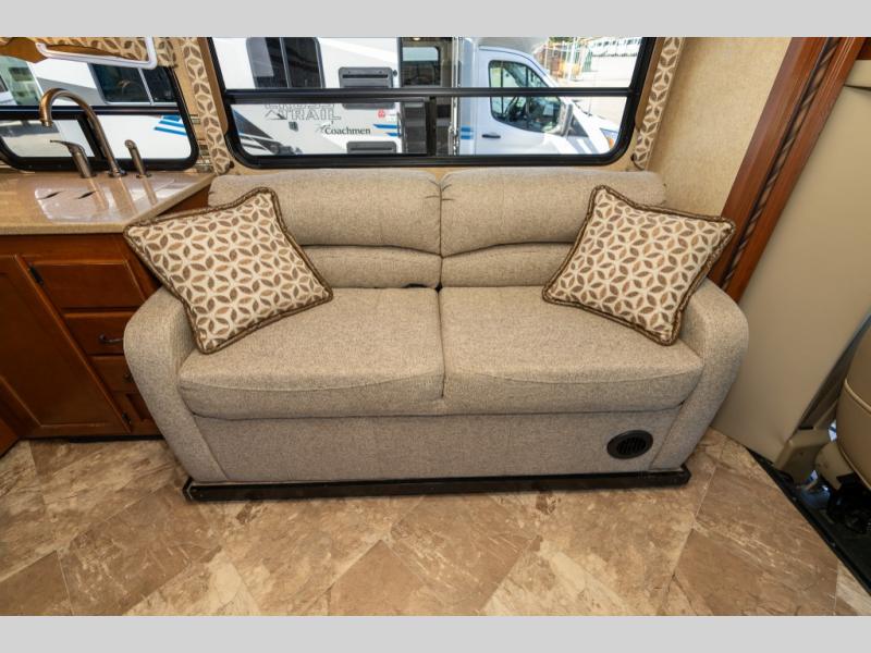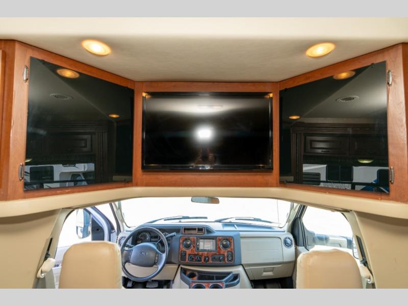 As you step inside to the right is a dream dinette slide that widens the living area space. At the front of the motor home is a 32" LED TV mounted above the cab area.