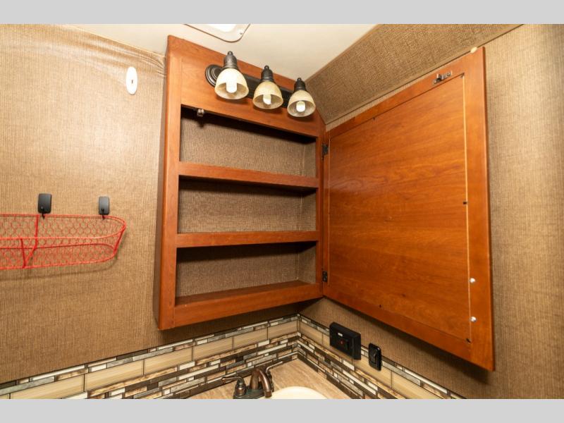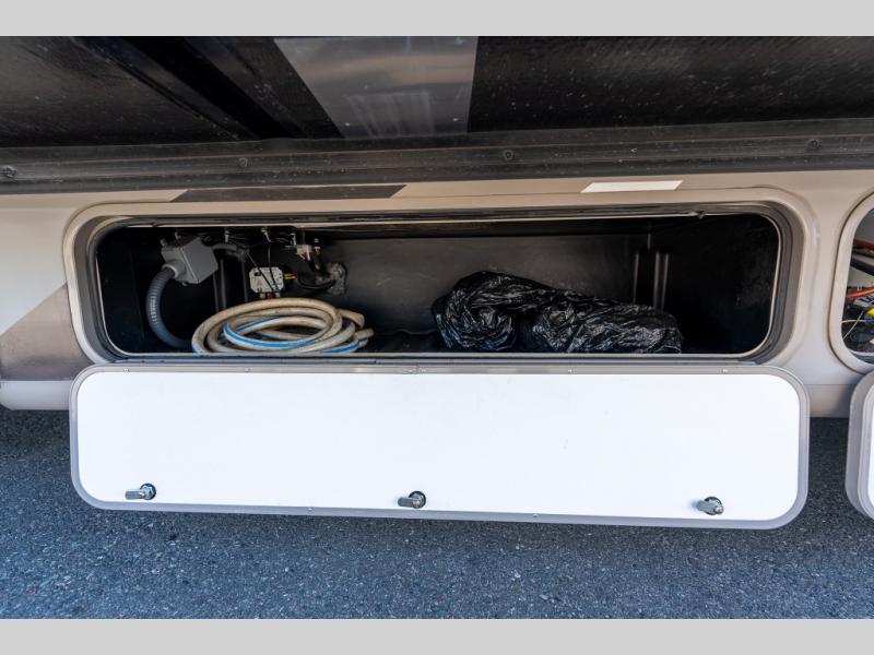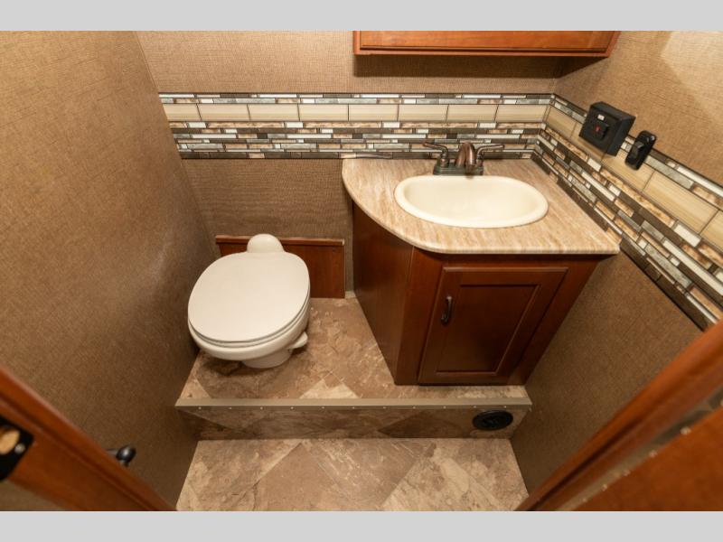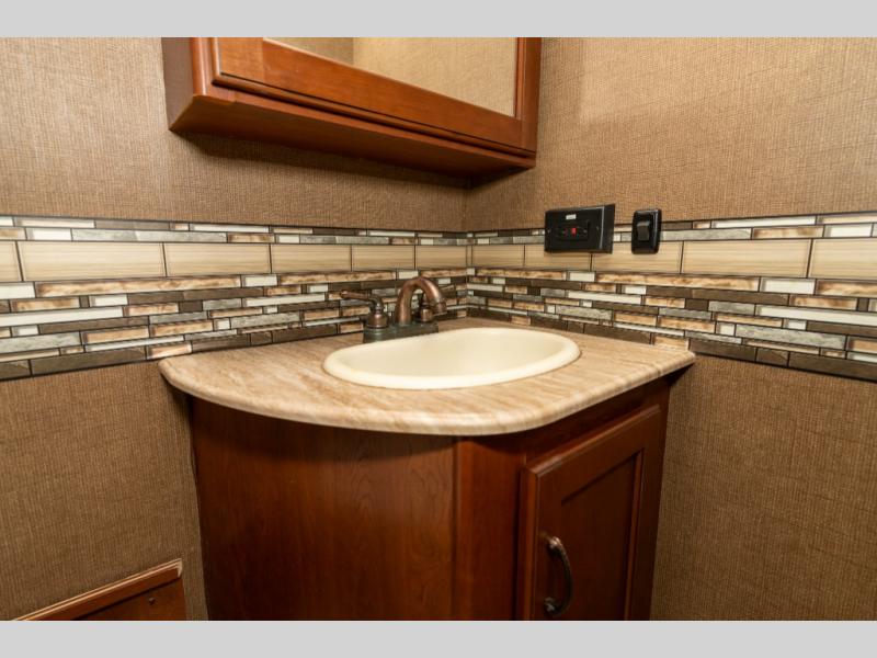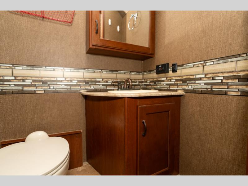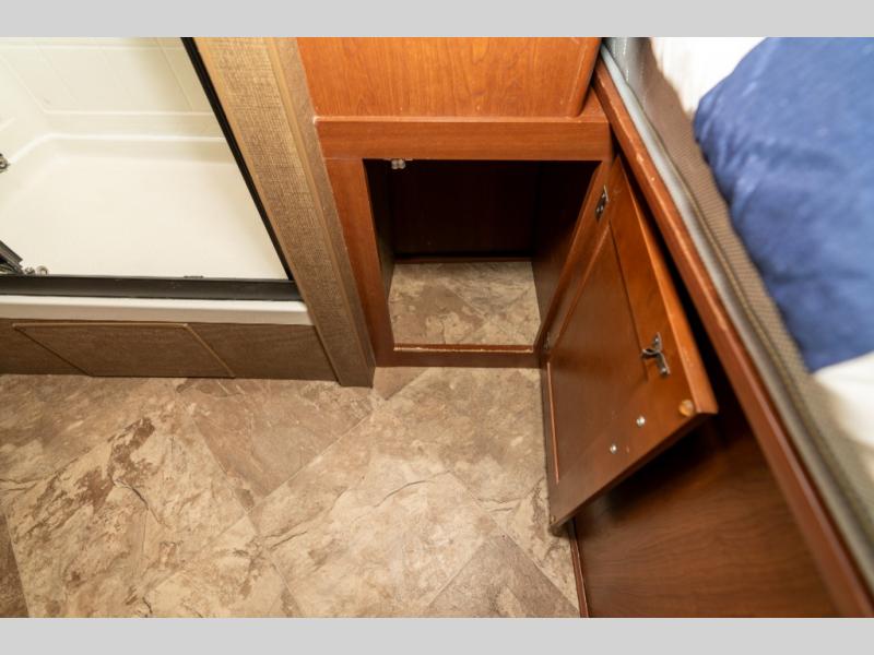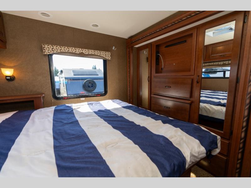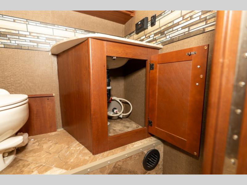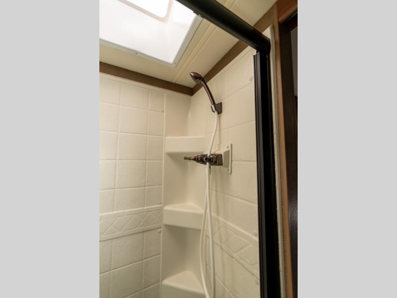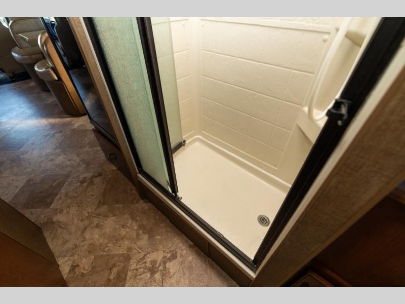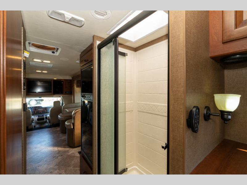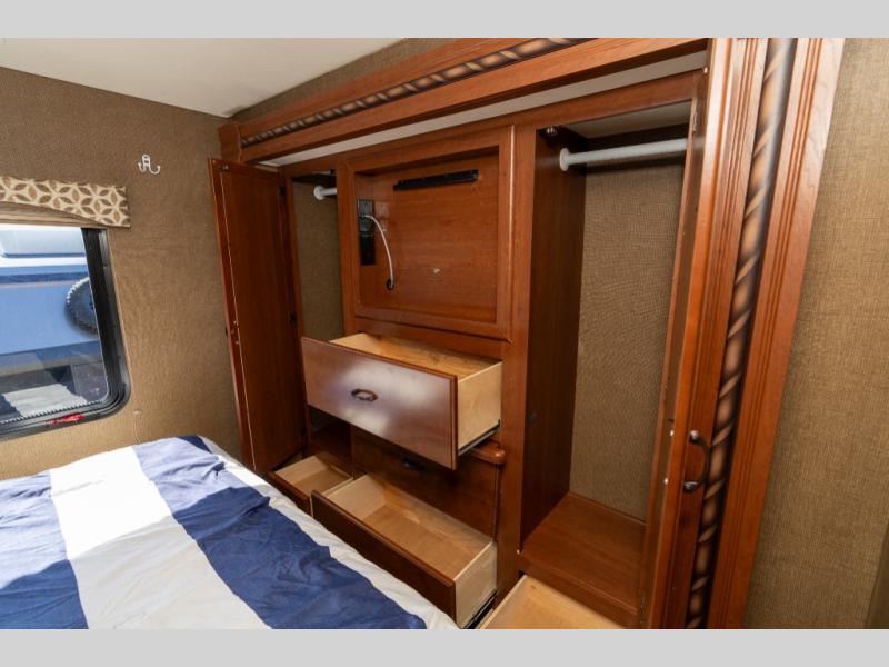 As you head to the rear of the motor home you will walk through a split bathroom which includes a private toilet and vanity sink with medicine cabinet to the right and a 24" by 36" shower to the left. The private rear queen bedroom has access to both sides of the bed with a wardrobe and 32" LED TV slide out for storage on the opposite side.