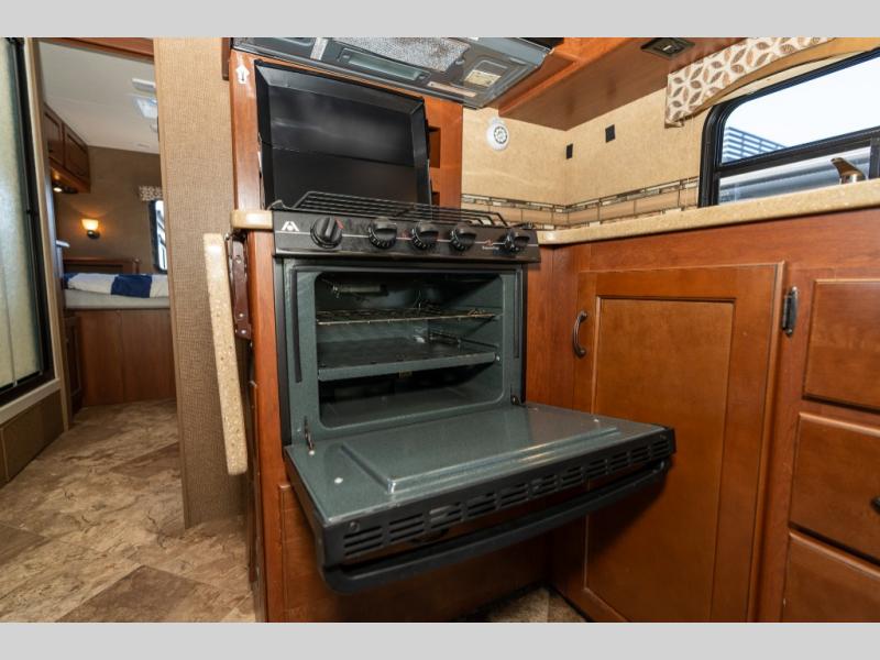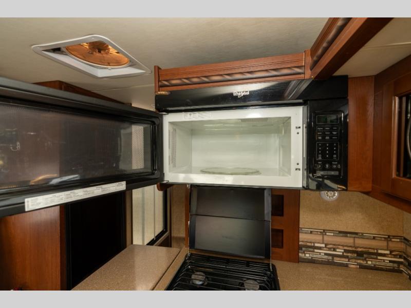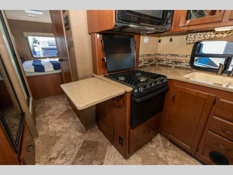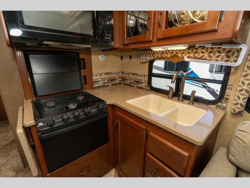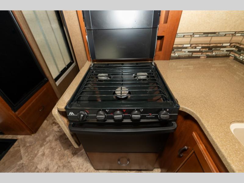 The kitchen/living area includes a second slide out that features a sofa with queen air bed and kitchen countertop with a double sink that allows for more prepping space. A three burner range and overhead microwave, flip-up countertop, and a refrigerator with a storage drawer below makes this kitchen complete.