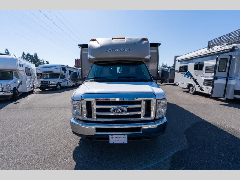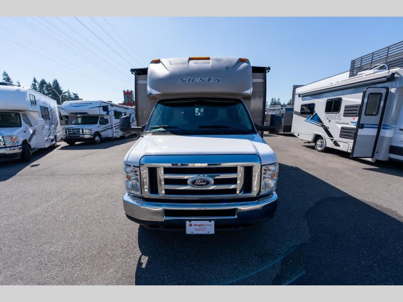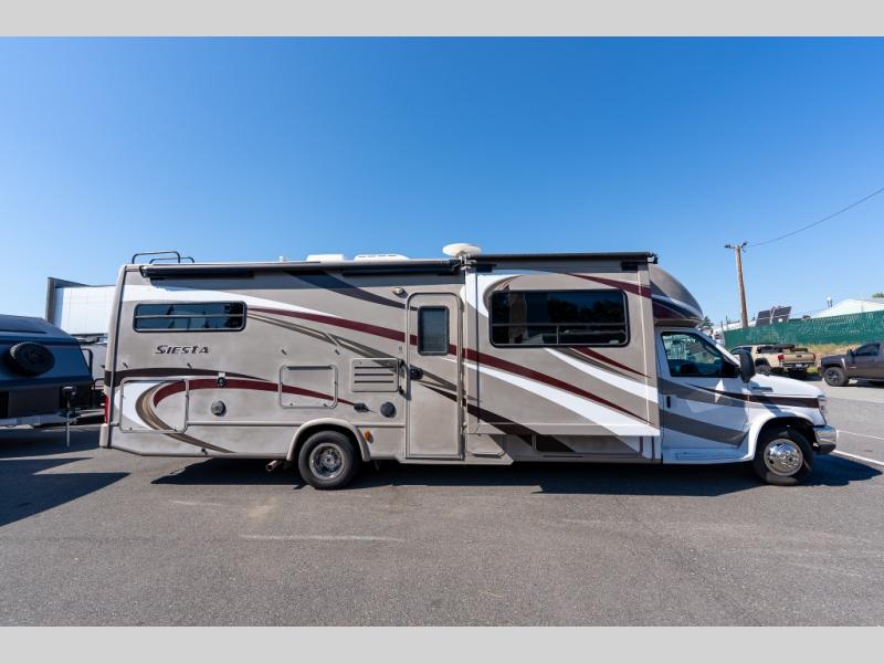 This triple slide Thor Motor Coach Siesta 29TB Class C gas motor home has all the space you would want and more featuring an open kitchen and living area with slide outs opposite one another plus a master bedroom slide as well.