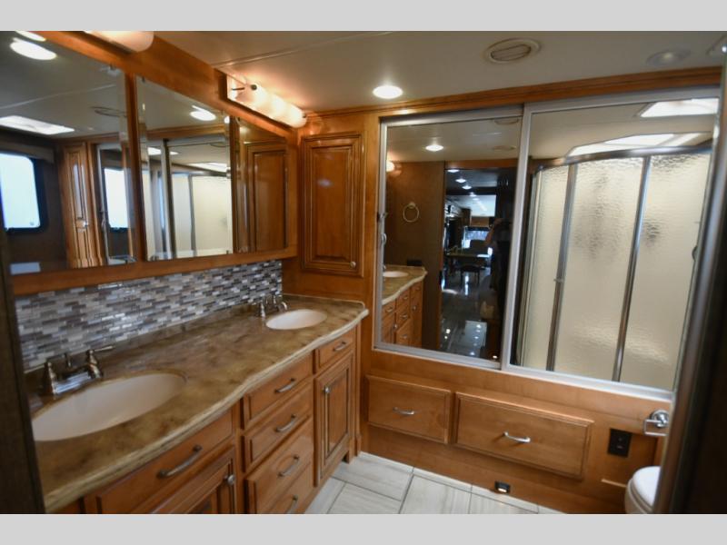 The Tuscany 45AT offers a spacious bath layout with high-end fixtures, a large shower, and abundant storage. The master suite features a king-size bed, wardrobe storage, washer/dryer prep or installed units (varies by coach), and additional television for private relaxation.