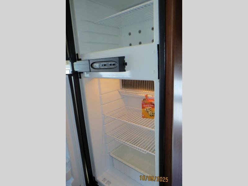 The rear left corner features a nice kitchen area where you will enjoy cooking up light meals and snacks. There is a refrigerator for your perishables, a round sink, plenty of counter space and upper and lower storage for dishes and things, plus a three burner range with overhead microwave oven, and so much more!