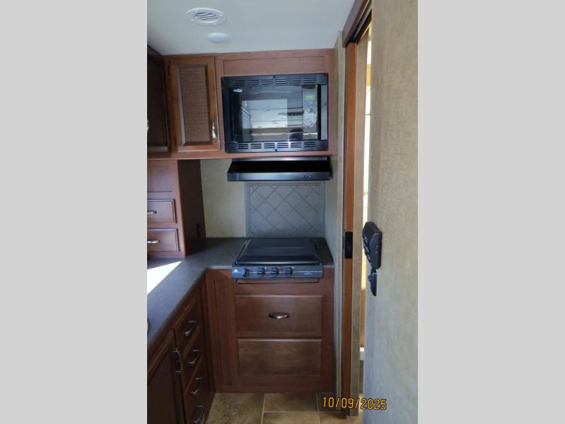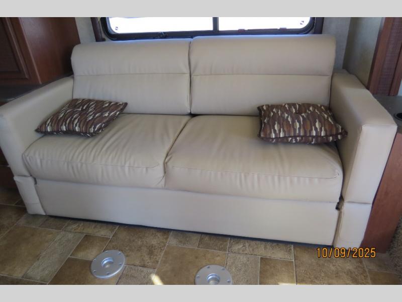 Step inside the entrance just behind the passenger seat where there is a 28" LED TV mounted above. Straight ahead find a slide out sofa with air bed and end table that creates a bit more walking around space when fully extended. There is a pedestal table for dining, and the sleeping area is 60" x 74" making it comfortable for two! You can also find more sleeping space in the drop down overhead bunk that is 36" x 72" for one extra individual.