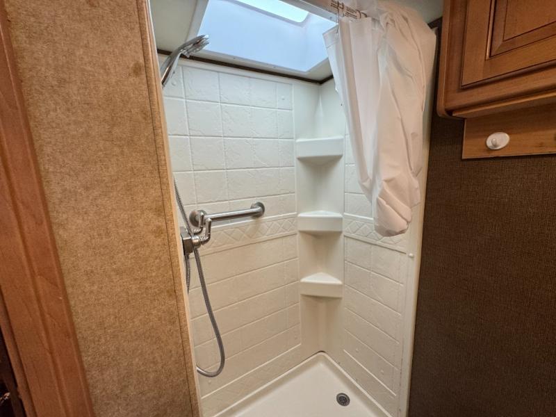 Opposite the kitchen area find a convenient full bath with 24" x 36" shower, toilet, overhead storage, medicine cabinet and vanity with sink. There is a linen cabinet just outside the bath door on your left when looking in.