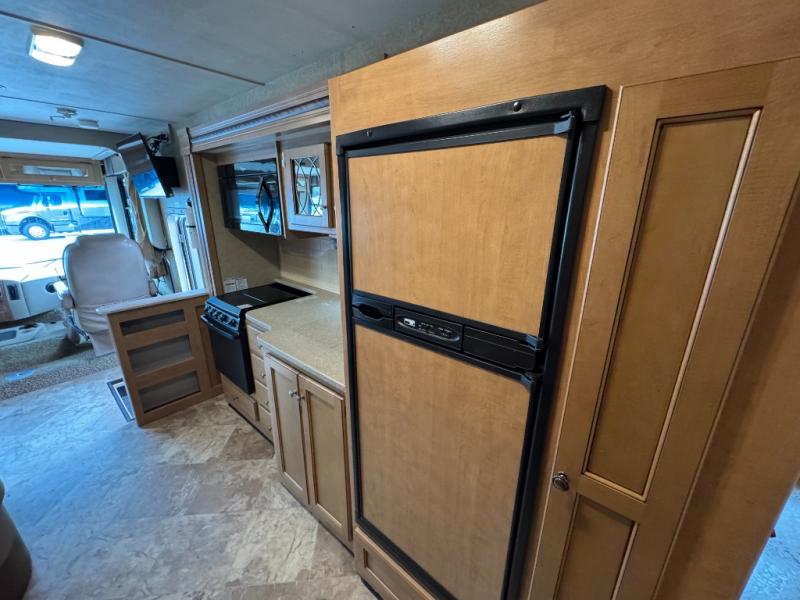 To the left of the entrance you will find all the kitchen amenities needed to prepare and cook food while you are traveling. There is a slide-out 3 burner range with overhead microwave oven, a large kitchen sink, refrigerator, and pantry, plus overhead storage cabinets for dishes and things. This slide also includes the rear bedroom nightstands and king size bed.