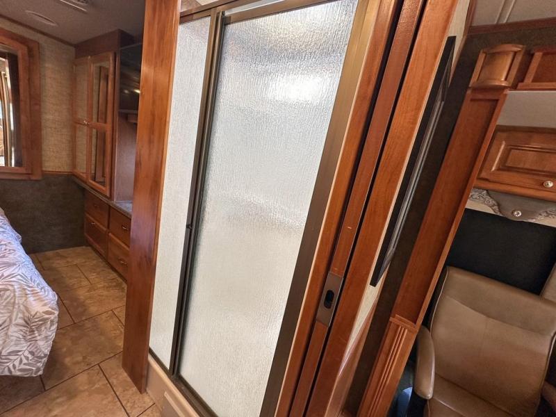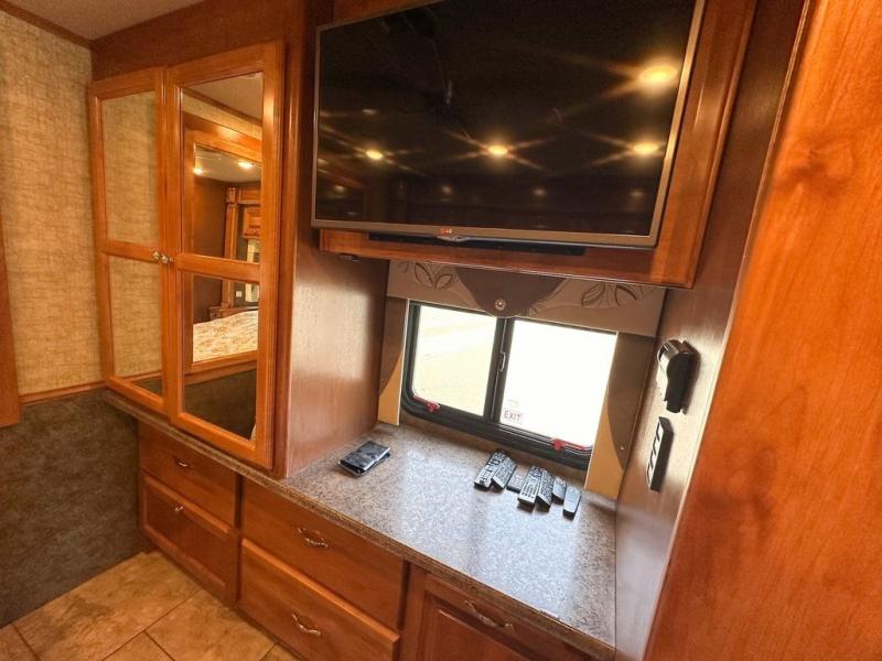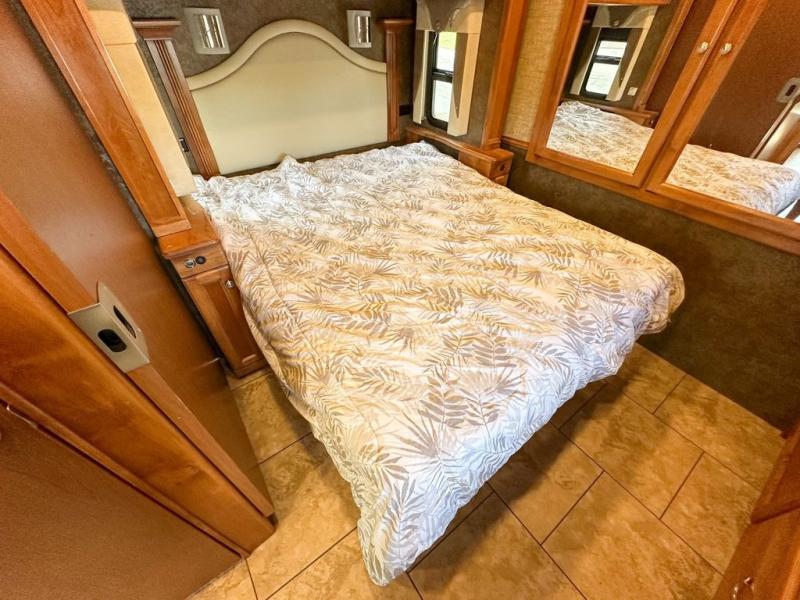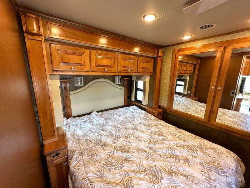 The rear bedroom has a slide with a queen bed that has nightstands at each side and overhead cabinets above the head of the bed. The rear wall of the coach features a large storage area, while the wall opposite the bed features a wardrobe with drawers below, and a vanity with a TV above it.