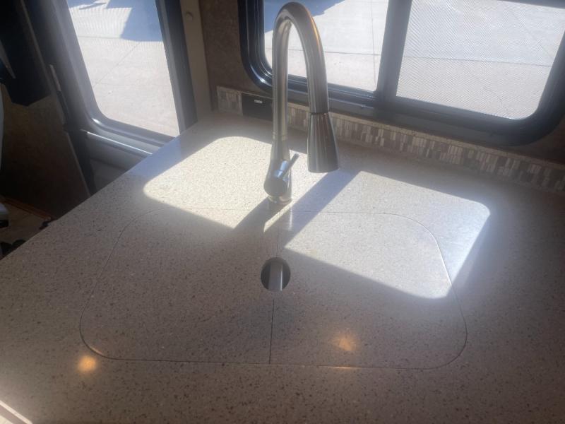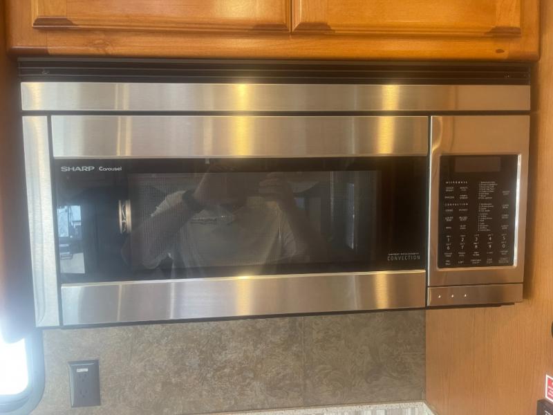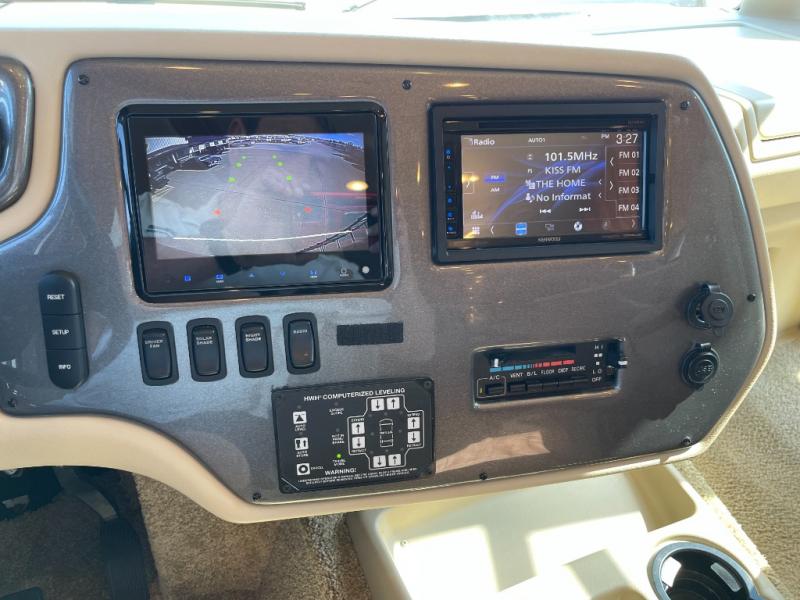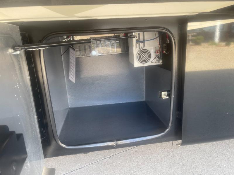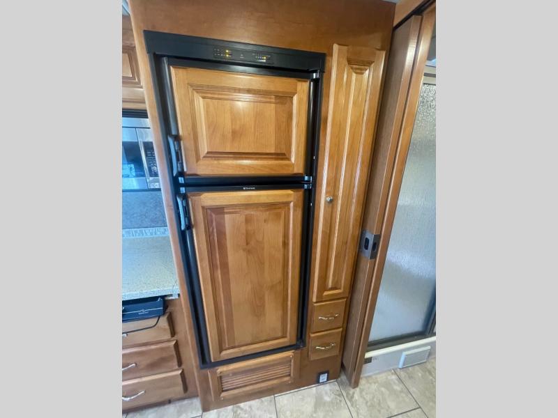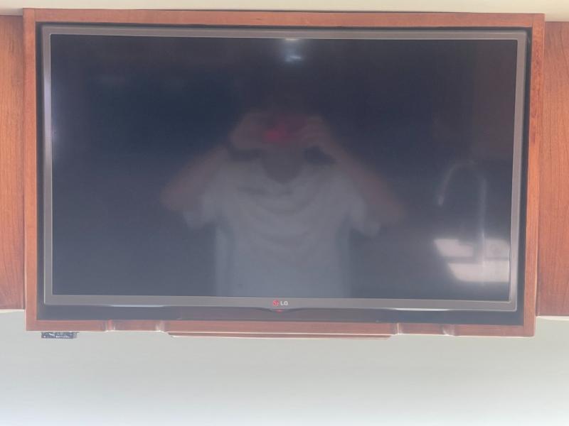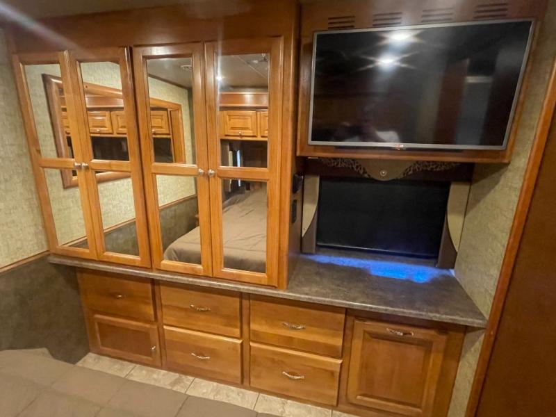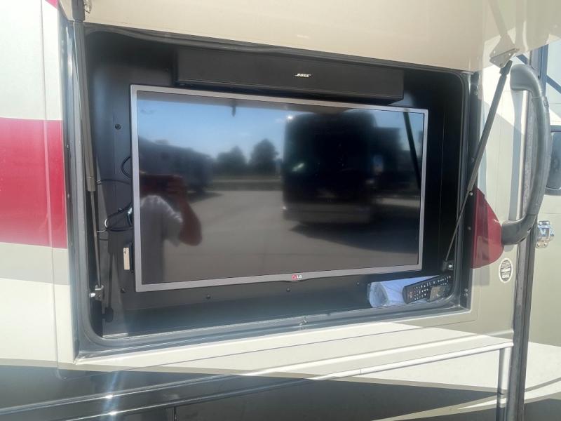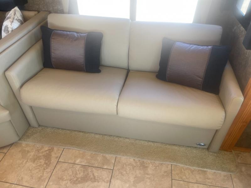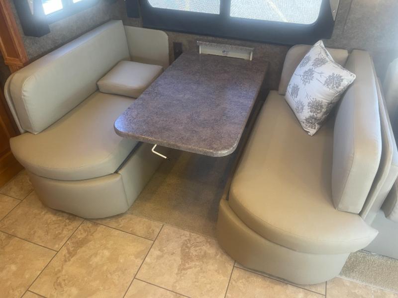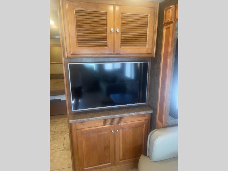 The road side includes a large slide with sofa bed, booth dinette and overhead cabinets. You may choose an optional dinette with computer workstation in place of the booth dinette. A standard TV is mounted at the back of the living area for easy viewing from any seat.