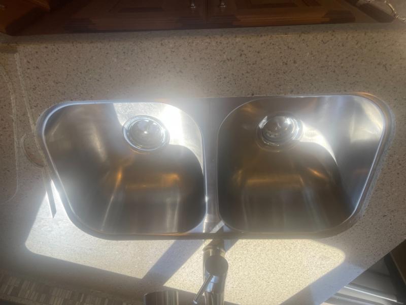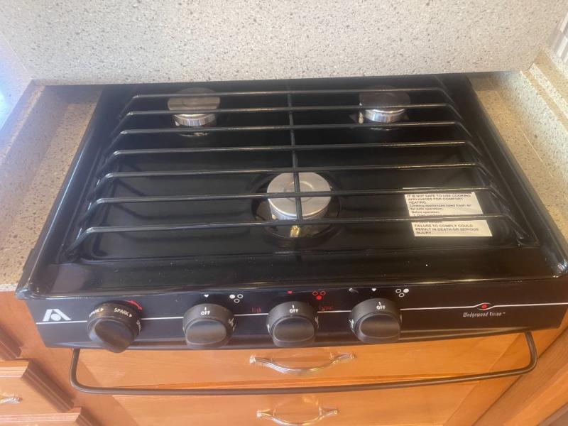 The kitchen along the curb side includes a pantry, refrigerator, three burner range, overhead microwave, angled double sink and overhead cabinets. A lounge chair and ottoman are just beyond the entry steps, with more overhead cabinets.