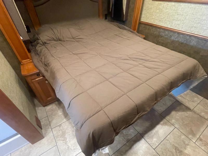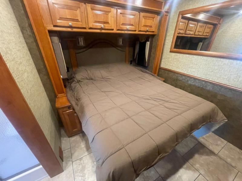 The rear bedroom provides a queen bed slide out with nightstands at each side of the bed and overhead cabinets above the head of the bed. The opposite wall includes a wardrobe with drawers below and a vanity with a TV above it.